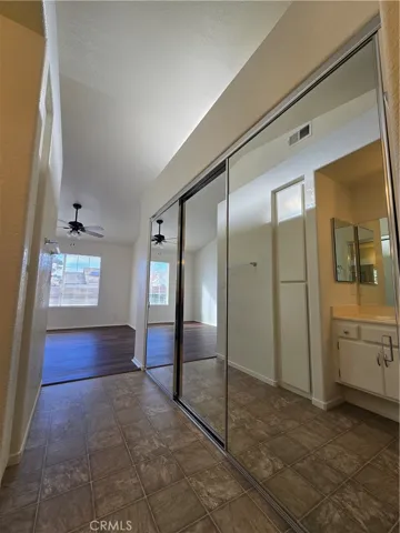 Primary bedroom with mirrored closet doors
