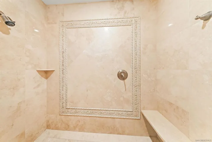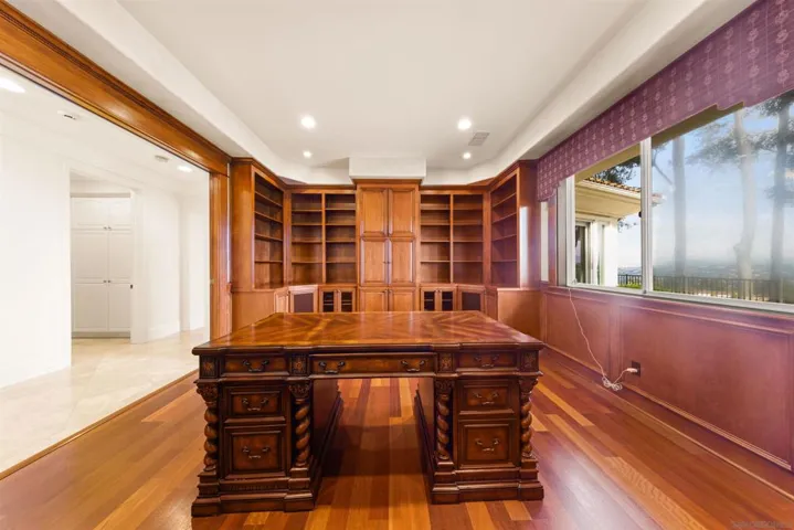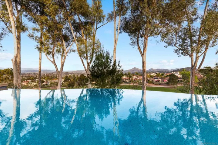 Nestled within an exclusive private gated cul-de-sac of only six custom estates, this exceptional Rancho Bernardo residence offers rare privacy, scale, and unobstructed panoramic golf course and mountain views. Spanning over 5,700 square feet, this custom-built estate is thoughtfully designed for both grand entertaining and comfortable everyday living. The home features 4 bedrooms and 3.5 bathrooms, including a main-level primary suite ideal for long-term comfort and accessibility. A dramatic grand entry with soaring ceilings and a striking circular staircase sets the tone for refined living. The gourmet kitchen is appointed with custom cabinetry and generous workspace, seamlessly connecting to expansive living and family rooms with built-ins. Additional highlights include a dedicated executive office on the first floor and a spacious upper-level loft/game room, offering flexibility for work, recreation, or multigenerational living. Significant recent upgrades include new roof tiles (2023), a new water heater (2023), and a fully owned 71-panel solar system (2023), providing energy efficiency without compromising luxury. The resort-style backyard is a true retreat, featuring a custom infinity-edge PebbleTec pool positioned to capture breathtaking golf course and mountain views, ideal for relaxing or entertaining. Rarely does a property of this size, privacy, and view orientation become available in such an intimate gated enclave. A unique opportunity to own a timeless estate in one of Rancho Bernardos most coveted locations.
