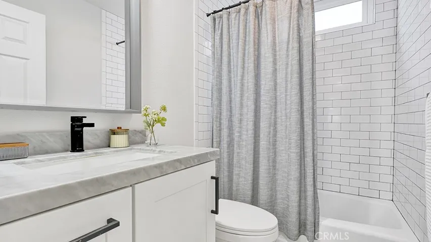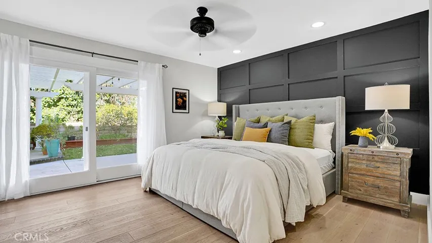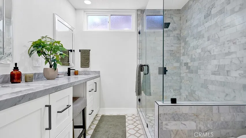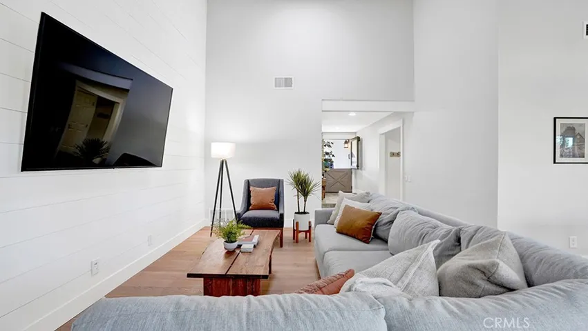 Welcome to 26801 Calle Maria, a stunning 3-bedroom single-level home in Mission Viejo that combines modern upgrades with timeless charm. Step inside and be greeted by an open floor plan that effortlessly connects the kitchen, dining, and living areas, creating an inviting space perfect for gatherings. The kitchen is a showstopper, featuring marble countertops and backsplash, smart appliances, and a kitchen island. Unwind in the bright, airy space, accentuated by vaulted ceilings and a shiplap accent wall. An additional living area provides flexible space for hobbies, work, or relaxation. The primary suite boasts a paneled accent wall, dual sliding-door closets, and a gorgeous primary bath with a sliding barn door, mosaic tile flooring, skylight, double vanity with marble countertops, and a marble-tiled shower. Two more bedrooms are located down the hall, accompanied by a guest bath with a marble countertop and a classic subway-tiled shower. Beautiful hardwood floors cover the main spaces and bedrooms. Seamlessly integrated shaker-style cabinetry extends from the kitchen into the bathrooms. Smart lighting throughout the home enhances both convenience and ambiance.