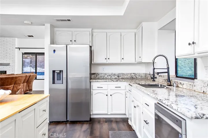 Owned solar, Lake views, room for toys and single story! Located on the north side of Southern California’s premier, gated, waterfront community of Canyon Lake this single story stunner pool home is sure not to disappoint! If views are what you’re interested in than look no further as this home capitalizes on 180 degrees of surrounding hills and the main lake/beach!! Upon entry your met with vaulted ceilings, a classy white washed brick fireplace and a massive open layout for the family/dining area. Enjoy new LVP floors throughout along with fresh interior paint! Your kitchen boasts more than ample cabinet space with granite counters, double ovens, recessed LED lighting and even lake views from your kitchen window! The master bedroom is well appointed with tons of natural light, a slider to your pool area and an oversized ceiling fan. Your recently updated master bath offers a duel sink vanity, walk in closet, separate toilet room and large shower with separate soaking tub. Both spare bedrooms have a huge footprint and share a Jack and Jill bathroom. No need to worry about guests as they can use the 3rd bathroom located just off the main living area complete with feature wall and stylish mid-century modern mirror and light fixture. There’s more natural light in this house than you can imagine with ample dual pane, tinted windows throughout allowing you to capitalize on views from various areas. Enjoy entertaining in your backyard with pool/jacuzzi, plenty of room for entertaining, courtyard in the entry way and an upper pad in the back that capitalizes on unobstructed views of the surrounding hills, community and main lake! Do you have toys? No need to worry about storage here as the 3 car garage offers 12′ high ceilings allowing for plenty of room for multiple car lifts and room to clear a 32′ motorhome/trailer or easily fit a boat in the driveway. Canyon Lake offers offers a low 1.1% tax base with no Mello Roos bonds, 384 acre waterski/fishing lake, 16 parks most with beaches and playsets, basketball courts, baseball fields, tennis & pickle ball courts, equestrian center, 18 hole golf course, pools, dog park,has golf cart friendly streets, slalom course, ski jump, restaurants, community events and so much more!!! Live life on vacation in Canyon Lake!