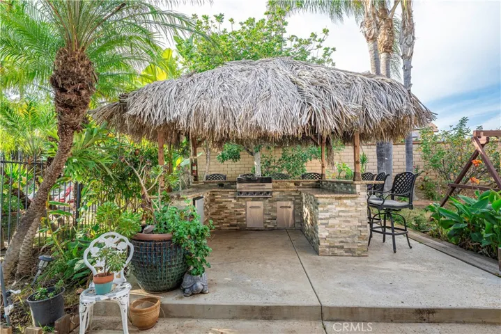The impressive two-story layout spans approximately 3,487 square feet and features 5 bedrooms and 5 bathrooms, thoughtfully designed to balance functionality with refined style. Upon entry, soaring two-story ceilings and an open floor plan create a bright, expansive atmosphere ideal for entertaining and comfortable living. At the heart of the home, the spacious family room features a built-in bar and flows seamlessly into the den and open gourmet kitchen, creating a natural gathering space. The kitchen offers granite countertops and a commercial-grade refrigerator ideal for hosting. A wet bar and adjacent game area further enhance the entertainment appeal. Set on a generous lot, the backyard serves as a private retreat. Enjoy a resort-style pool and spa with waterfall feature, complemented by a covered patio with built-in BBQ and decorative palm-style covering that adds a tropical touch. An oversized rear patio area and an additional patio off the family room provide multiple areas for indoor-outdoor enjoyment. Mature tropical landscaping and an array of fruit trees, including mango, lemon, lime, pomegranate, avocado, and persimmon, add beauty and character to the outdoor setting. Upstairs, the primary suite includes a spacious balcony overlooking the backyard, offering a peaceful space to relax and enjoy the views. The downstairs fifth bedroom includes an en-suite bathroom and flexible layout options. A portion of the three-car garage has been incorporated into this area, providing additional functional space. Buyers to verify all features, permits, and potential uses. Additional highlights include surround sound in the bonus room and solar panels for energy efficiency (buyer to verify system details). Conveniently located near schools, parks, shopping, dining, and major transportation routes, this home offers a rare combination of size, amenities, flexibility, and outdoor living.