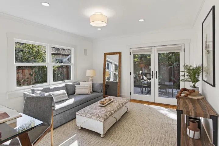 Quintessential Palo Alto bungalow with modern amenities in the coveted Community Center neighborhood. Expanded & extensively remodeled with permits in 2009, this light-filled home features hardwood floors, large windows & flexible floor plan with a spacious fourth room opening to the backyard ideal as a family room or 4th bedroom. The kitchen is anchored by a deep garden window & offers refinished custom cabinetry with soft-close drawers, pantry pullouts, soapstone counters, picket backsplash, Sub-Zero built-in refrigerator, Bosch appliances, induction cooking, Vent-A-Hood exhaust & under-cabinet lighting. The remodeled primary bath includes heated floors, steam shower, floating cabinetry, pendant lighting, wall-mounted toilet & ample storage. The hall bath features heated mosaic porcelain floors, deep soaking tub, subway tile & pedestal vanity. Professionally landscaped front & backyards offer stone pavers, outdoor lighting, gas fire-pit & private entertaining areas. Additional highlights include detached garage, gated driveway with Tesla charger, upgraded electrical & plumbing, keyless entry, tankless water heater, central heat and A/C, Caseta smart switches & new roof (2025). Walk to downtown, library, Community Center, Rinconada Pool, Art Center, zoo, top-rated schools.