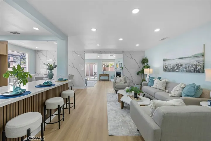 This home features a bright living area and a fully remodeled open-concept kitchen with stainless steel appliances, an oversized island, and slim-profile oak cabinetry for a modern Scandinavian-inspired look.