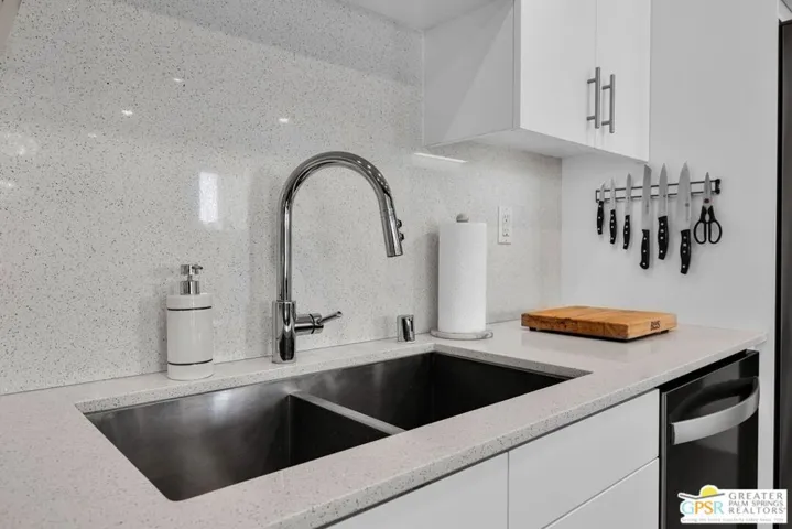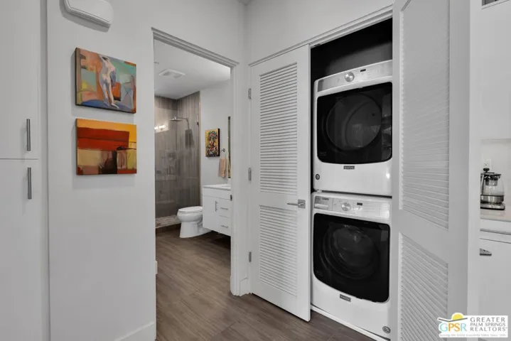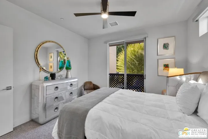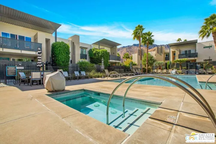 Live the Palm Springs resort lifestyle at this modern, newer-construction condo located just minutes from the Uptown Design District. This desirable south-facing upper-level residence offers tree-top views and sweeping mountain vistas to the south and west, creating a light-filled, elevated living experience. The thoughtfully designed open-concept floor plan features soaring 9-foot ceilings with exposed beams and floor-to-ceiling low-E windows that frame iconic Palm Springs scenery like works of art. The spacious kitchen is equipped with quartz countertops, stainless steel appliances, and designer pendant lighting, flowing seamlessly into the living and dining areas. Relax and enjoy the large private covered balcony with expansive views, an ideal space for outdoor lounging, entertaining, and taking in the surrounding scenery. Additional highlights include fully paid solar with a 10-panel, 2.9 kW system, a tankless water heater, stackable washer and dryer in-unit, and covered carport parking, along with ample guest spaces and community EV charging. Located within the gated 64@The Riv community, residents enjoy lush mature landscaping, a 60-foot resort-style pool and spa, fire features, covered seating areas, gas BBQs, and a gated dog park. The unit is ideally positioned within the complex away from busy streets and oriented to maximize privacy and mountain views. The home also features integrated, remote- and voice-controlled smart home technology, including smart lighting, motorized roller shades, a smart thermostat, alarm system, smart locks, and a doorbell camera for added convenience and security. Fee simple ownership, low HOA dues, and 30-day minimum rentals per community guidelines make this an exceptional opportunity for both full-time living and extended stays. Modern, stylish, energy-efficient, and priced to move, this beautifully appointed 2-bedroom, 2-bath condo offers 1,226 square feet of living space and was built in 2018, delivering outstanding value in one of Palm Springs’ most desirable locations.
