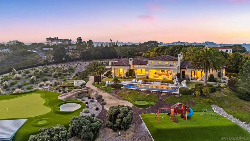 Step out of your home and onto your own private golf course at Querencia at El Camino, set on 4.62 acres in the highly sought-after West Side Covenant of Rancho Santa Fe. This approx. 8,000 sq. ft. estate offers privacy, space, and stunning southwest views. The backyard has been transformed into a golfer’s dream with multiple tee locations and two full-sized greens, ideal for practicing shots up to 110 yards while enjoying unobstructed Covenant scenery. Designed for single-level living, the main home features six en-suite bedrooms, plus a detached 1-bedroom, 1-bath casita with kitchenette and separate service quarters with a full kitchen. A gated, winding driveway leads to the home, creating a private and welcoming arrival. Inside, the expansive great room includes a 40-foot retractable glass wall for seamless indoor-outdoor living. Additional highlights include gallery-style hallways, a steel front door, private office or library, wet bar with wine storage, and a spacious primary suite with dual walk-in closets and a private patio with jacuzzi. The gourmet kitchen features an oversized waterfall marble island, high-end appliances, coffee bar, and cantina windows opening to the outdoor kitchen. Outdoor spaces include a sunken fire pit, outdoor fireplace, and BBQ bar—perfect for entertaining. Nearly 5 acres offer room for additional amenities, with permitted plans for an extra garage. Minutes from Del Mar beaches, shopping, dining, and equestrian trails.
