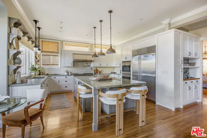 Situated in the heart of Sunset Park, Santa Monica’s fastest emerging nook, this tastefully appointed Mediterranean residence is framed by majestic palms, draped in cascading ivy, and set privately behind a custom gate. As you enter the courtyard, you’re met with manicured gardens and tranquil water features that create an immediate sense of serenity. In nearly 3,500 square feet, the home is defined by it’s generous scale and functional layout. The gourmet chef’s kitchen is a study in craftsmanship. It’s equipped with a built-in breakfast banquet, granite surfaces, a custom tile backsplash, an oversized island, Sub Zero and Wolf appliances, and ample storage. The appliances include a Wolf stove, Miele dishwasher, Sub-Zero wine refrigerator, two Sub-Zero freezer drawers, and a Sub-Zero refrigerator. The primary suite is a quiet retreat with soaring ceilings, expansive windows, and a skylight that fills the space with natural light. It’s adorned with a fireplace, access to a private balcony and an en-suite custom bathroom with bespoke tile-work, a soaking tub, and a large walk-in closet. All of the bedrooms have access outside. The rear yard is a private expanse of space. The pool, spa, outdoor fireplace, and built-in Ipe deck seating make the ideal venue for dining alfresco cradled by lush landscaping. Other features include a newer roof, newer Velux skylights throughout, and a whole-house water filtration and softening system. Custom wrought iron details can be found on the fireplace screens, facade, and gates, and there is a wood-burning fireplace in the living room. With the beach, shopping, and dining all close by, this location delivers easy access to both neighborhood amenities and coastal living.
