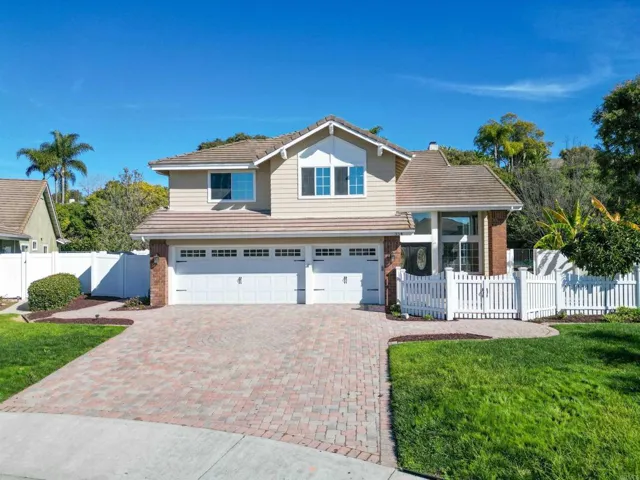 Beautifully maintained two-story home with an attached finished three-car garage with tons of storage located within the highly desirable community of Whelan Ranch in Oceanside. Frame by a friendly white picket fence and situated on a cul-de-sac on an ample .48 acre lot this amazing residence boasts custom features throughout with steam clean Travertine tile and hand scraped wood flooring, a wrought iron staircase, updated bathrooms, concrete shingle roof, whole house water filtration system, whole house fan, and heavy duty insulation. brand new dual fuel HVAC solar ready. Vaulted ceilings with large windows bask the home in an abundance of natural light. A dream kitchen featuring granite countertops, new stainless steel appliances, a farmhouse style sink, ledgestone backsplash, center island, and crisp white cabinetry that opens to the family room with a cozy fireplace. All bedrooms are upstairs including the spacious primary suite offering a huge walk-in closet with custom shelving and its own en-suite bathroom with dual sinks, stone flooring, a relaxing soaking tub, and custom walk-in shower with an edgeless door. Outdoor living has been extended to the peaceful and serene backyard featuring thoughtfully designed hardscape including a spacious patio area, walkways, and lush landscaping with several varieties of fruit trees, flowers, and roses. There is plenty of room to have a swimming pool installed and/or ADU. This yard has a shed for plenty of storage space or can be use as a studio. Very private yard, you won’t need window treatments. We have the largest lot in the neighborhood all with a Wi-Fi irrigation control system. Garage has been completely painted and epoxy flooring , House was fumigated on Feb, 2025. Sound system and Alarm system are already installed in the house. Conveniently located, just minutes away from beautiful beaches, surfing, fishing, boating, shopping, dining, parks, Whelan Lake, hiking trails, golf amenities, Colleges and Universities, Highways 76 and 78, and Interstates 15 and 5, plus so much more. Extremely low HOA and No Mello Roos! Don’t let this opportunity pass you by!!