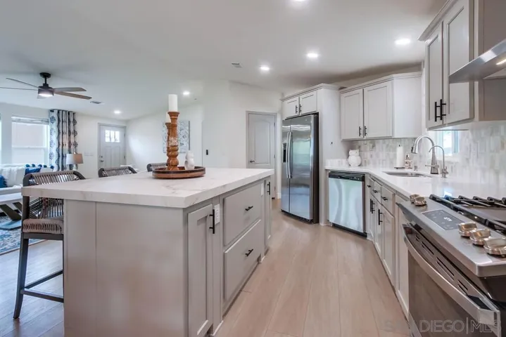 This is the one you have been waiting for in Madrid Manor where you OWN the LAND! 1 year old house with 3 bedrooms, 2 bath, open concept living, custom flooring thru out including Luxury Vinyl Plank, tiled bathrooms and indoor laundry room. (no carpet) kitchen with marble backsplash, Touch faucet, reverse osmosis system, lots of storage with cabinets upgraded with pull outs, walk in pantry, upgraded stainless steel appliances and new wine fridge. Wine and coffee area, center island with custom porcelain countertop, hard surface countertops thru out. Fireplace with custom surround and plug for tv above, spacious master suite with walk in closet with closet organizers and cabinetry, tiled shower, double vanities and custom make up area. Upgraded lighting in baths, dining and exterior. Front spare bedrooms with hall office area and French doors into spare. Custom ceiling fans in each room and many additional ceiling lights thru out home. Exterior painted in light grey and white, large private outdoor space with stamped concrete that looks like pavers, vinyl fenced large yard, new shed. Ring camera, Low maintenance landscape on automated drip system and to top it off a great Avacado tree! Home is 15 months New! Home located in the esteemed 55+ Madrid Manor community in San Marcos. YOU OWN THE LAND!! Madrid Manor has many amenities, including a pool, spa, clubhouse, tennis/pickleball courts, billiard room, card/game room, and library, in addition to numerous social events. The manufactured home has a 433 A permanent foundation.