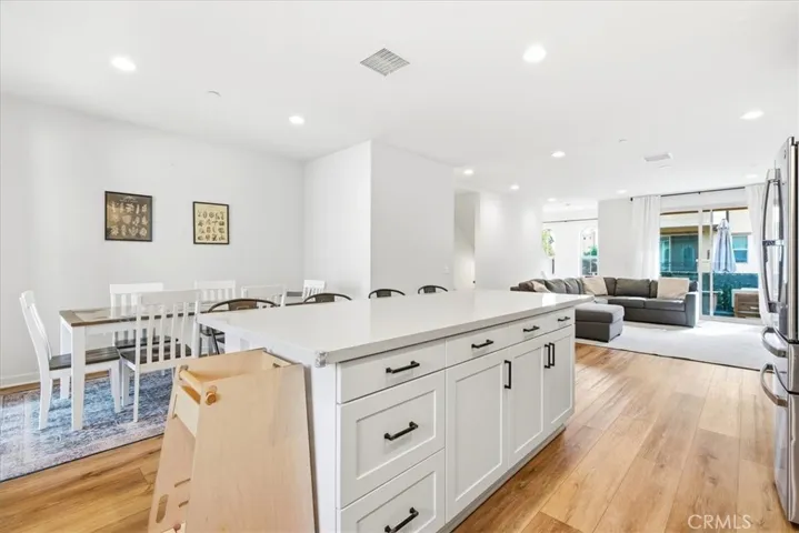 The heart of the home is the stunning gourmet kitchen, featuring quartz countertops, an oversized center island with breakfast bar seating, abundant cabinetry, stainless steel appliances, and an adjacent dining area that flows effortlessly to the covered balcony — perfect for hosting gatherings or enjoying relaxed evenings at home.