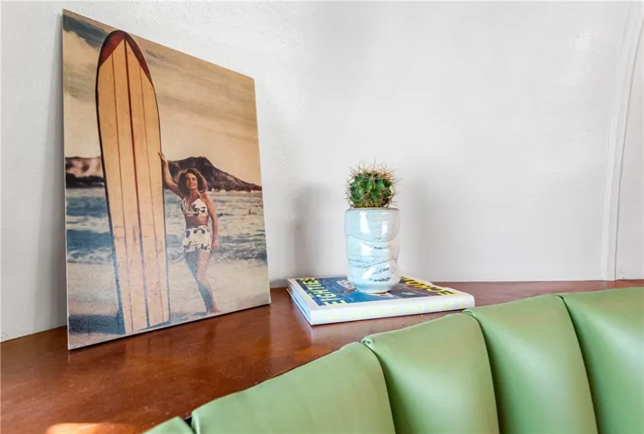 The home features an open-concept kitchen and living area designed for easy everyday living and entertaining. The kitchen includes butcher block countertops and a cooktop that faces the main living space, creating a welcoming and functional gathering area. Vintage and mid-century modern touches are thoughtfully incorporated throughout the home, giving it a clean, eclectic, and comfortable coastal feel.