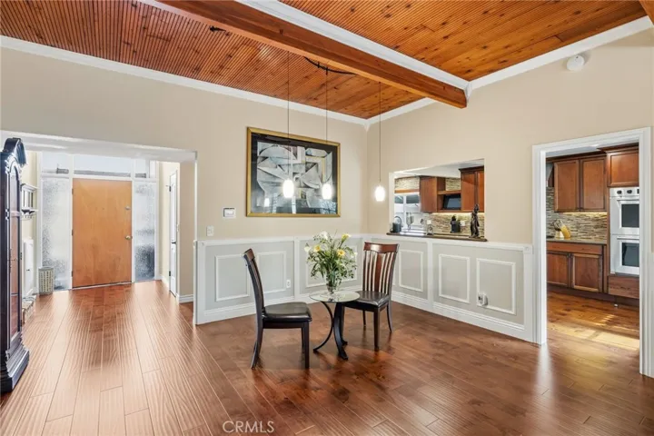 The main living areas are warm, open, and filled with natural light. Highlights include a chef’s kitchen designed for both entertaining and everyday living, hardwood floors in impeccable condition, and refinished wood slat ceiling accents that showcase the home’s mid-century character. Original decorative mid-century window grates add rare architectural charm while preserving the integrity of the design.