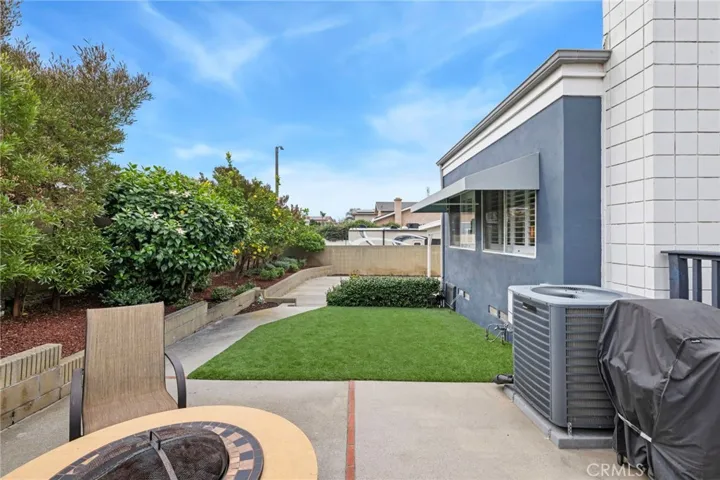 The private backyard is ideal for Southern California living, featuring low-maintenance turf, a stylish fire pit, and a patio space perfect for relaxing or entertaining year-round.