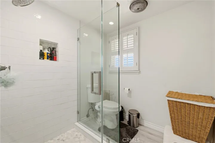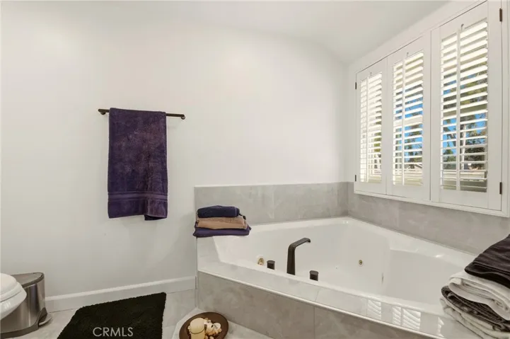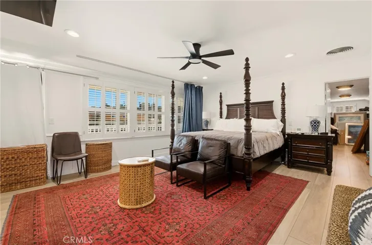 Upstairs features four bedrooms, including two primary-style suites for flexible living arrangements. The main primary suite offers plantation shutters, space for a sitting area, a walk-in closet with built-ins, and an ensuite bath with soaking tub and glass-enclosed shower. A separate laundry and utility room with extensive cabinetry adds convenience.