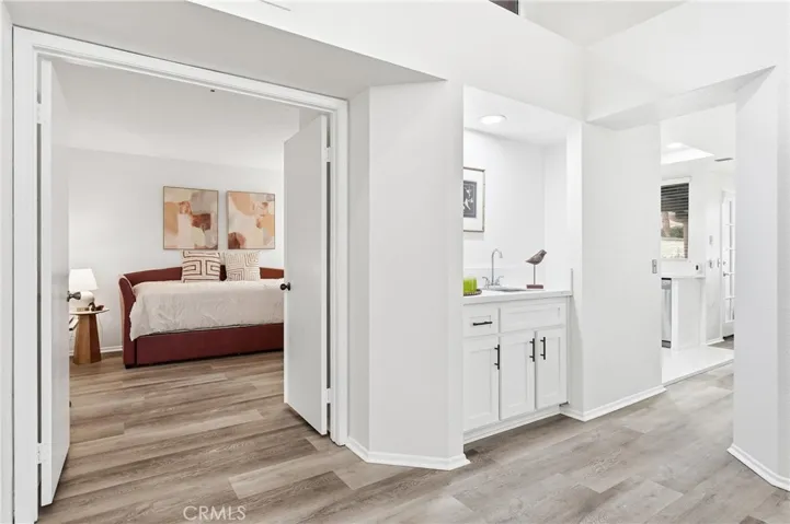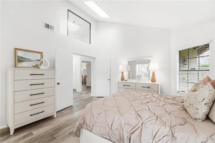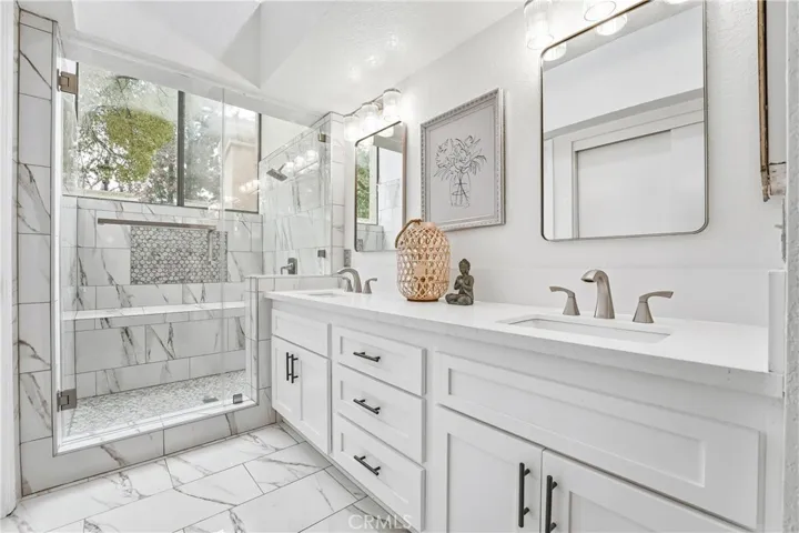 Located in Prestigious Mountain Meadows, the most desirable gated community in the area—featured in Architectural Digest in the 1980s—this beautifully renovated single-story PUD offers style, comfort and convenience. As you enter, you’re greeted by dramatic high ceilings and abundant natural light streaming through clerestory windows. The spacious living room features a cozy fireplace, wet bar and newly installed warm-toned laminate hardwood flooring that flows seamlessly throughout the main living areas. To the right of the living room is the dining area, highlighted by a charming wicker chandelier and sliding glass doors that provide direct access to the backyard—perfect for indoor-outdoor living. The fully renovated kitchen, located just behind the living room, showcases white shaker cabinetry, new hardware, quartz countertops, porcelain tile flooring and stainless-steel appliances. A sunny breakfast nook overlooks the backyard, making it an inviting space for everyday meals. On the left wing of the home is a guest bedroom with an ensuite bathroom, which also serves as the hall bath. At the rear of the home, the private primary suite offers a peaceful retreat with a spacious, fully remodeled ensuite bath featuring dual vanities, quartz countertops, white shaker cabinets, a stunning walk-in shower with custom tile work and a large walk-in closet. Additional highlights include a generously sized backyard, an attached 2 car garage and a prime location close to shopping, dining, and freeway access. Combining architectural pedigree with contemporary comfort, this beautifully updated residence is a rare offering in one of the area’s most coveted gated communities. This is the one you’ve been waiting for—come see it before it’s gone!