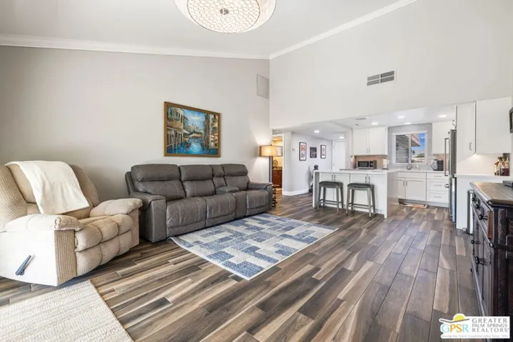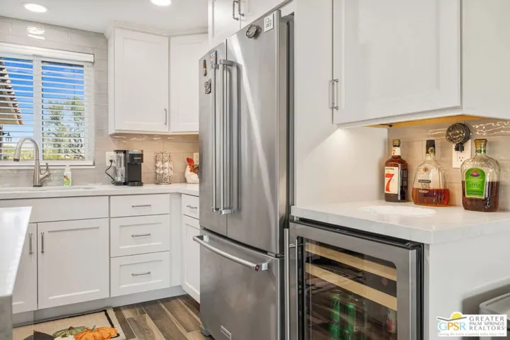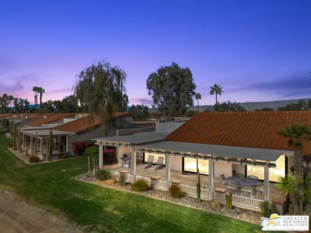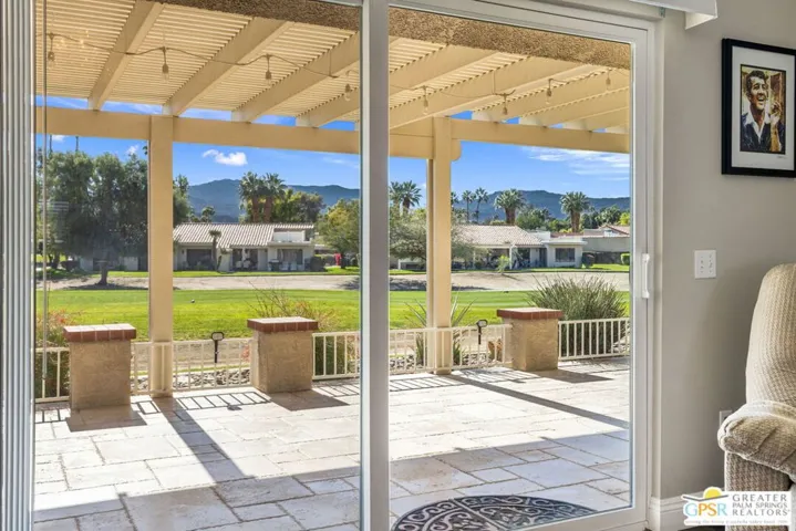 Welcome to Palm Desert Resort Country Club, where resort living meets thoughtful design and exceptional pride of ownership. This beautifully remodeled 2-bedroom, 2-bath residence has been renovated with care, quality, and attention to detail throughout. The brand-new kitchen is a true showpiece, featuring waterfall quartz countertops, a custom backsplash, stainless steel appliances, an electric hood-less range, built-in wine refrigerator, recessed lighting, a new ceiling, and an upgraded electrical panel. New ceramic tile wood-style flooring flows seamlessly through the home, complemented by vaulted ceilings and new wooden doors. Both bathrooms have been fully remodeled with elegant Carrera stone finishes. The spacious guest suite offers an oversized walk-in closet and sliding doors leading directly to the patio. The primary suite also features patio access, an oversized walk-in closet, and blackout shades for ultimate comfort. Step outside to one of the largest patios in the community, complete with a covered pergola, BBQ, and patio furniture, perfect for entertaining or relaxing while enjoying gorgeous mountain views, a serene lake, the 15th fairway, and a tranquil pond frequented by swans and geese, bordered by a custom riverbed. Automatic exterior sensor lighting adds convenience and security. Additional highlights include a 2-car garage with air conditioning, large enough to accommodate a full-size truck, plus ample storage, shelving, water heater, and washer/dryer. Located on fee land, this property allows 7-day minimum short-term rentals and is part of a vibrant resort community with an HOA covering golf course maintenance, lush landscaping, 24-hour guard-gated security, clubhouse access, tennis, pickleball, bocce ball, and multiple pools and spas. An exceptional opportunity to own a move-in-ready home offering luxury, views, and true resort-style living.