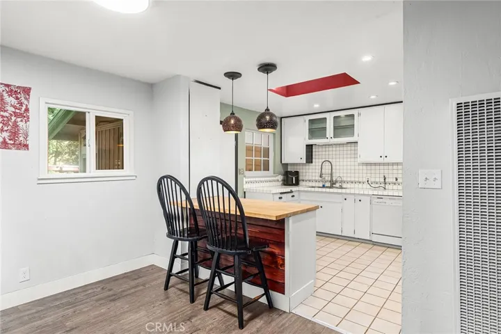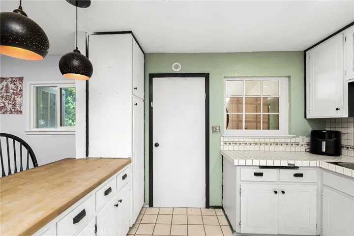 The kitchen is designed for both function and creativity, featuring a large 5-burner stove, butcher block countertops, and plenty of space to cook and gather. A separate laundry area adds convenience and includes a washer, dryer, refrigerator, and extra storage.