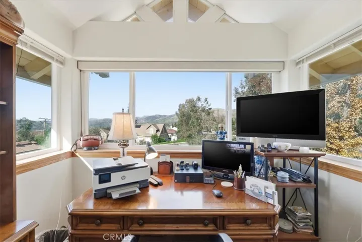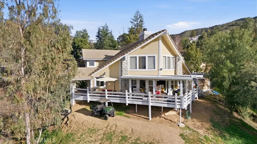 This unique two-story home radiates a cozy mountain vibe with soaring high ceilings that create an open, airy feel. Featuring three bedrooms and two baths, the layout is both comfortable and functional, perfect for everyday living or weekend escapes. The home includes two separate living room areas, offering flexible space for relaxing, entertaining, or gathering with guests. A wraparound deck and along the back side of the home invites you to relax and take in scenic views of surrounding nature—an ideal spot to enjoy stunning sunset skies. The office nook and loft area on the second floor offers inspiring views of the San Bernardino mountains, making work-from-home days feel like a retreat.
