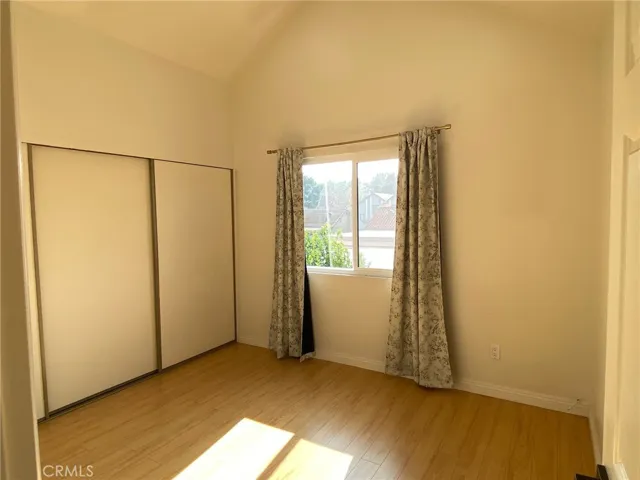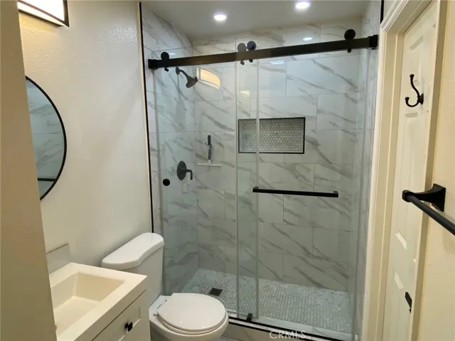 Dining area open to living room and kitchen with French doors leading to the side and backyard patios. One bedroom downstairs with French doors, one remodeled bathroom downstairs with bidet. Two bedrooms upstairs included primary bedroom with vaulted ceiling, recessed lighting, and direct access upstairs bathroom. Both bathrooms with remodeled tile shower walls, glass doors, hardware, vanities, and quartz countertops. Newer laminate flooring and recessed lighting throughout. 2 car detached garage with automatic door opener, epoxy flooring, drywall, recessed lighting, water heater, washer and dryer which are included in sale. All window coverings included. Recent repairs included 3 new windows, termite completion, and brand new heater and thermostat. Recently updated electric meter. A/C unit has been serviced this month.