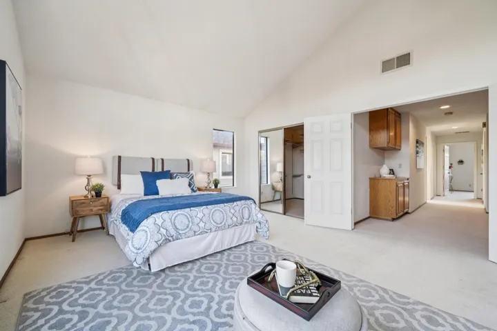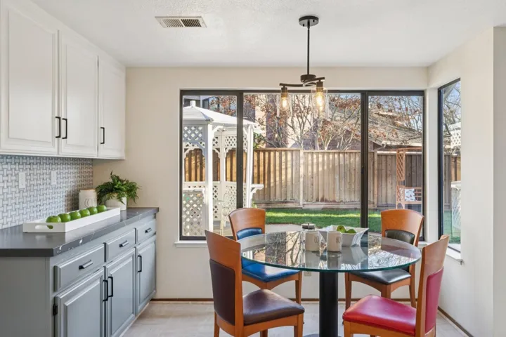Elegant 5-bedroom home in Woodbridge Estates, Harbor Bay; includes main-level bedroom and bath. This spacious five-bedroom, three-bath residence offers an eat-in kitchen, family room, open living and dining area, and a three-car garage situated on a generous lot. The main level includes a bedroom and full bathroom, providing space for guests, a home office, or an au pair. Cathedral ceilings, hardwood floors, and an open, sunlit floor plan. The updated eat-in kitchen features Quartz counters, plenty of cabinets, a fireplace, and a sliding door to a private backyard with a gazebo, mature landscaping, flower beds, and a patio—perfect for relaxing or entertaining. The spacious primary suite has vaulted ceiling & a walk-in closet and a makeover primary bath with walk-in shower and bathtub. Located 2 blocks from the SF Bay biking/walking trail & just minutes’ walk to top performing schools!