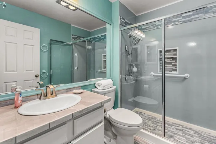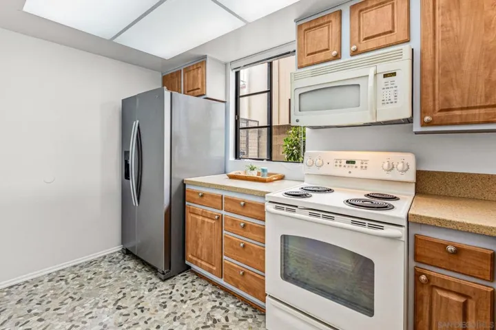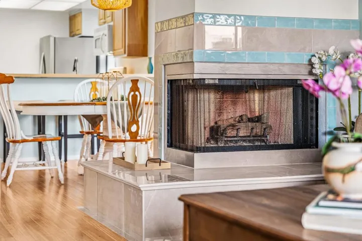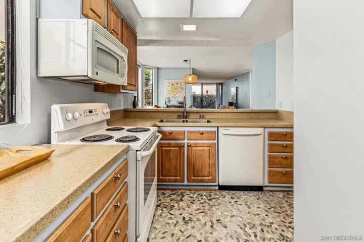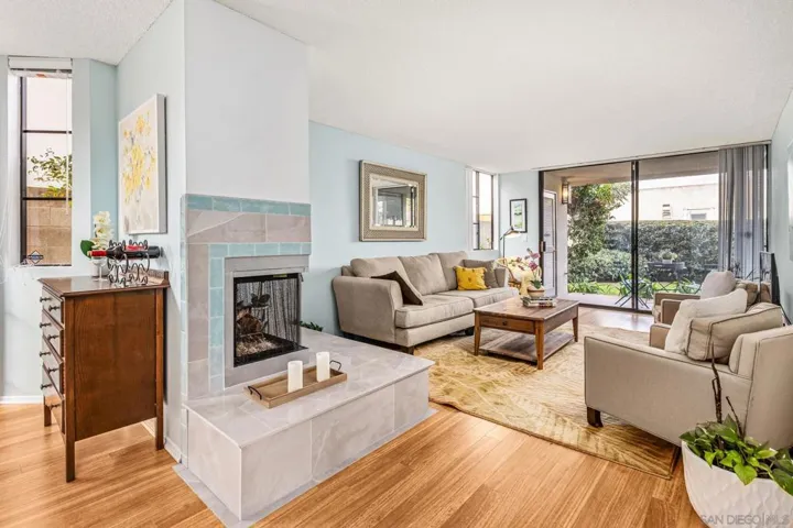 Coastal living in this rarely available ground-floor, end-unit 2-bedroom, 2-bath condo offering exceptional privacy with only one shared wall. Designed with a beach-inspired concept, this home features engineered wood flooring, tile throughout, beach-rock finishes, and large windows that flood the space with natural light. The spacious living room is highlighted by a fireplace with an oversized hearth, creating a warm, sophisticated ambiance ideal for entertaining or unwinding. Enjoy tastefully remodeled bathrooms, forced-air gas heating, and the convenience of in-unit laundry. Includes assigned covered garage parking plus easy street parking for guests. Located in a beautifully maintained community with a Community Room and BBQ area, and just moments from restaurants, bars, coffee shops, shopping, Shelter Island, and the San Diego Yacht Club. A standout opportunity for young professionals, first-time buyers, or anyone seeking the Point Loma lifestyle.