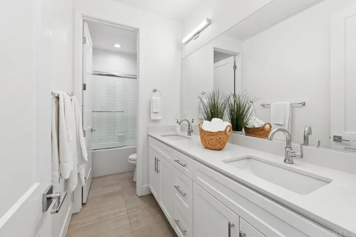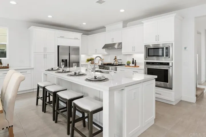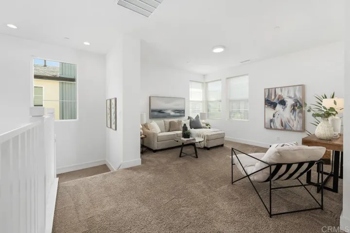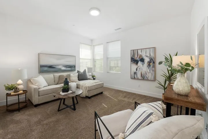 Welcome to this exceptional 4-bedroom, 3.5-bath, two-story residence located in Brio at 3Roots, one of San Diego’s most vibrant master-planned communities. This recently built home offers a rare blend of sophisticated design, modern comfort, and a premier central location. The bright, open-concept floor plan is filled with abundant natural light from expansive windows throughout the home. At the heart of the space is the chef’s kitchen, featuring a large center island, quartz countertops, stainless steel appliances, ample storage, and sleek contemporary finishes—perfect for everyday living, family meals, and entertaining. The dining area opens smoothly into the covered California room, complete with a cozy fireplace and fully retractable sliding doors, creating an effortless indoor-outdoor living experience ideal for gatherings or relaxing evenings. A full bedroom with an en-suite bathroom on the main level provides flexible living options for guests, multigenerational living, or a private home office. Upstairs, a spacious loft offers the perfect bonus space—ideal as a media room, playroom, or study area. The primary suite is a true sanctuary, featuring a spa-style soaking tub, dual vanities, and a generous walk-in closet. Two additional well-sized bedrooms and a bathroom provide the ultimate comfort. 2 car garage with epoxy flooring and tall storage cabinets. Life at 3Roots is designed with families in mind, offering resort-style amenities including two pools, parks and playgrounds, walking trails, and a state-of-the-art fitness center with classes by Fit Athletic. With a strong sense of community, abundant outdoor spaces to explore, and a central San Diego location close to schools, shopping, and dining, this turnkey home delivers the perfect balance of modern living and a family-friendly lifestyle.