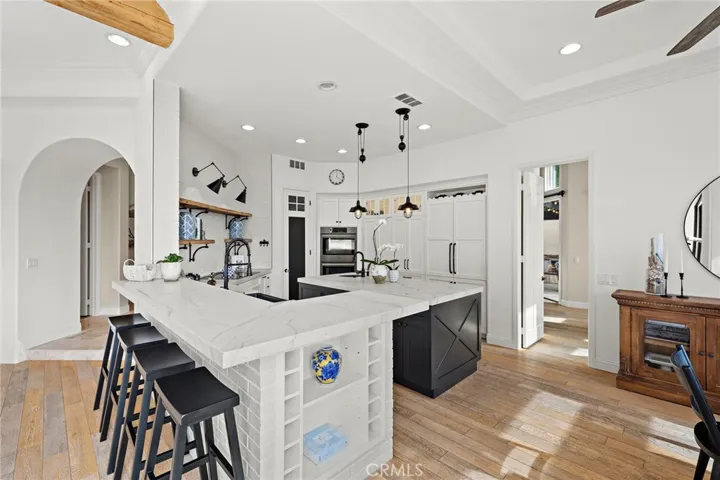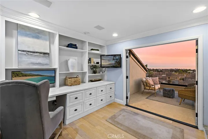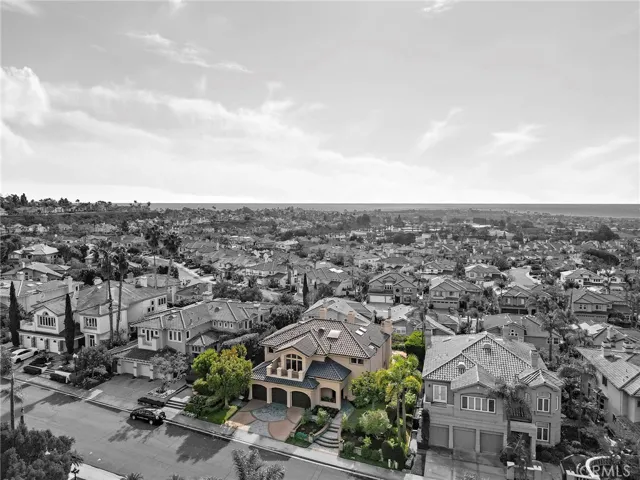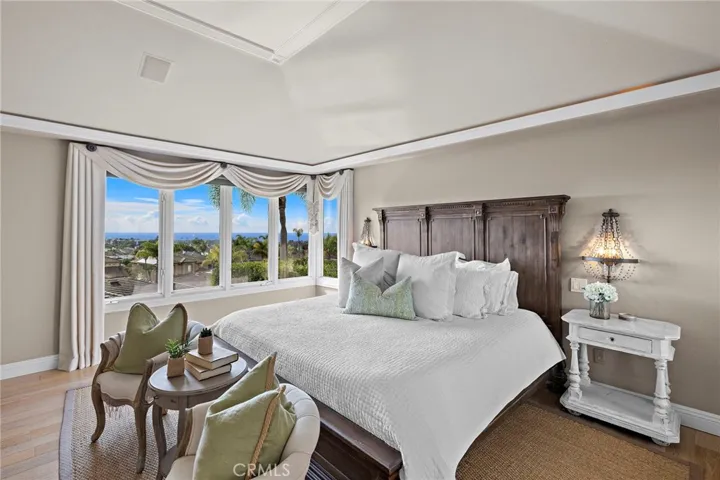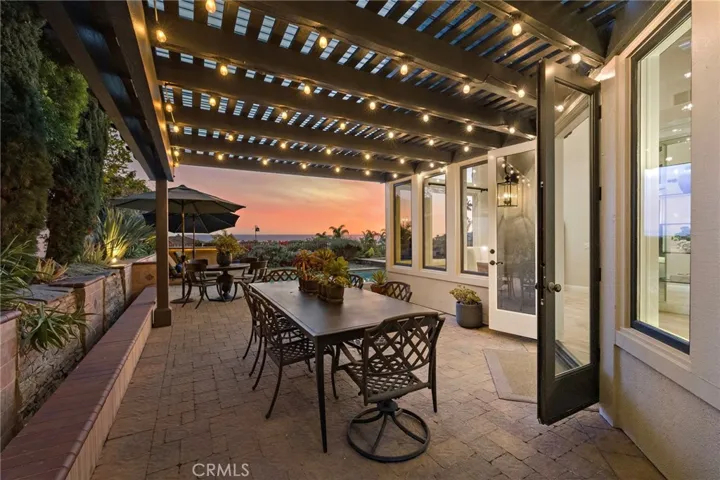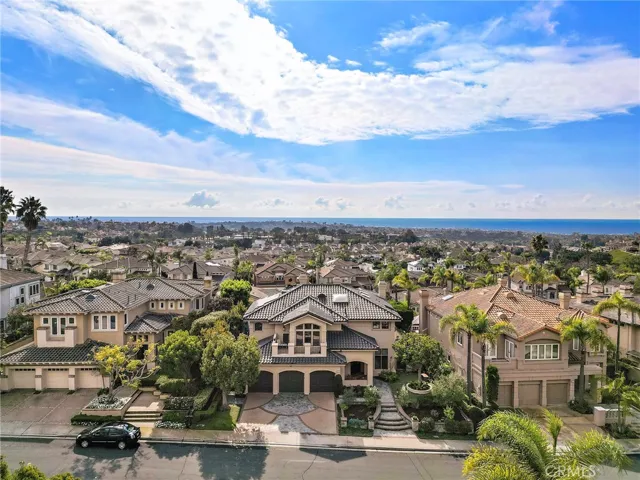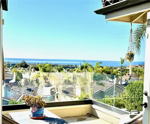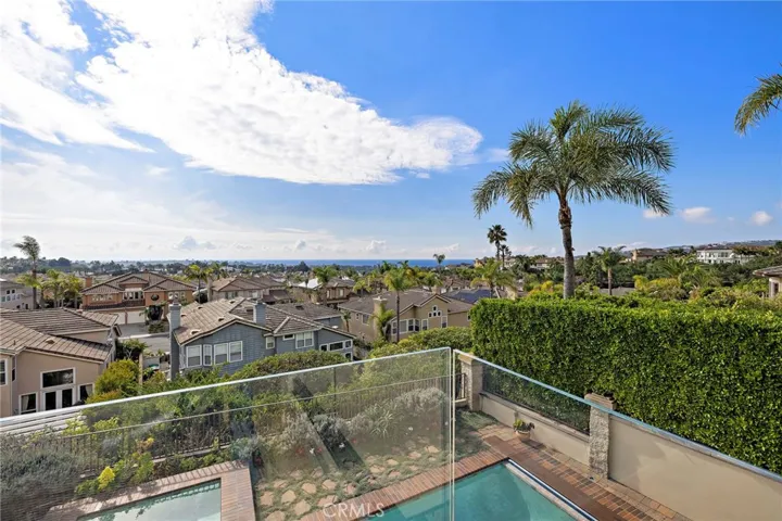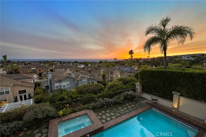 Positioned behind the gates of Ocean Ranch, this coastal residence captures EXPANSIVE OCEAN & SUNSET VIEWS (photos do not do justice) from Both First and Second Floors. Stone flooring introduces the entry, transitioning to vintage oak floors that continue throughout both levels of the home. The kitchen features custom cabinetry, Mont Blanc leathered quartzite countertops, reclaimed wood shelving, and a generous island. High-end appliances include double Bosch dishwashers, Bosch double ovens, a Dacor induction cooktop and refrigerator, wine storage, and a walk-in pantry. The kitchen opens to both the family room and a large adjacent breakfast nook, featuring an expansive picture window with glass-to-glass panel connections that frame the ocean view. The family room is anchored by a fireplace, reclaimed ceiling wood beams, and LaCantina bifold doors, creating an indoor-outdoor connection. The main level also includes a guest bedroom with en-suite bath, built-out library or home office, formal living and dining rooms, a powder bath with Venetian plaster, and a well-equipped laundry room with utility sink and laundry chute. Upstairs, the primary suite enjoys elevated ocean and San Clemente Island views and shares a double-sided fireplace with an adjacent office or retreat. The office/retreat features French doors that open to a sizable deck with spectacular ocean views. The primary bath includes a soaking tub, walk-in shower, imported Italian tile, dual vanities, and 2-spacious walk-in closets with custom organizers. Two additional guest bedrooms each offer en-suite baths. The backyard is designed for both entertaining and everyday enjoyment, with a saltwater pool and spa, waterfall feature, fire pit, built-in BBQ, separate bar, outdoor shower, and an inviting pergola with integrated lighting. Mature landscaping and ocean breezes complete the setting. Additional features include paid for solar panels, epoxy-coated plumbing, a low-water irrigation system. Ideally located near the harbor, beaches, and award-winning schools.