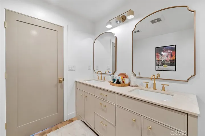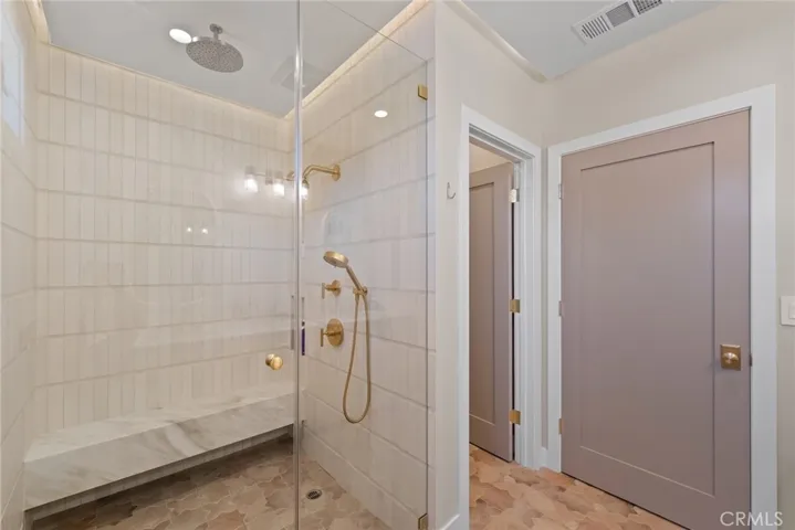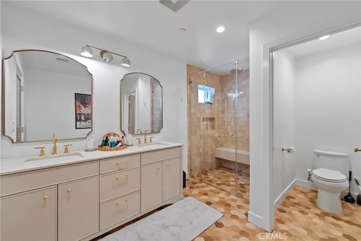 Upstairs features the upper-level primary suite in a private wing with walk-in closet, balcony, and spa bath with Calacatta Gold marble dual vanity, Kohler rain shower, and Zia Zellige tile, plus an additional bedroom, hall bath with Crema Breccia finishes, and full laundry with custom cabinetry and LG stackable washer/dryer. The lower-level primary suite includes a Crema Marfil marble vanity and direct access to the den and backyard.