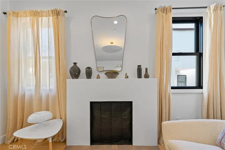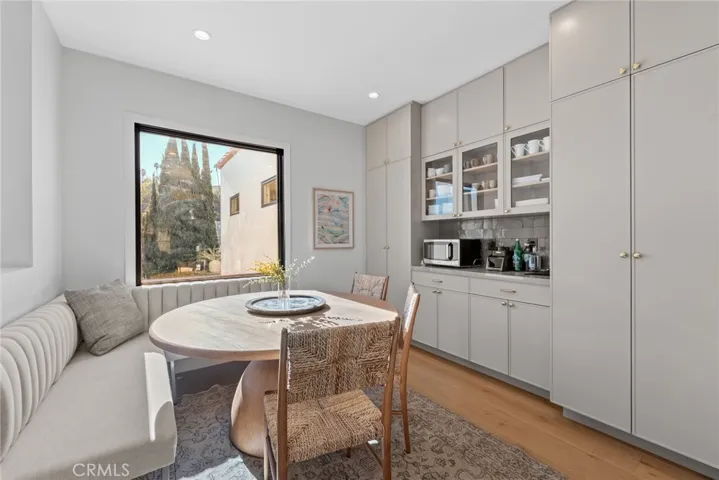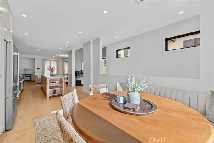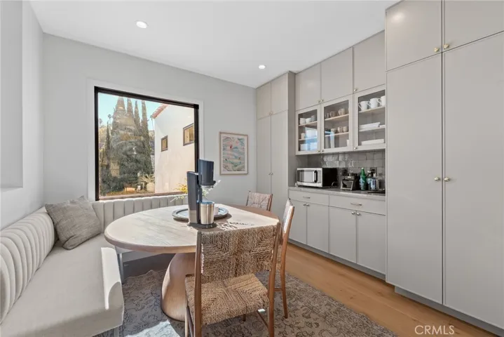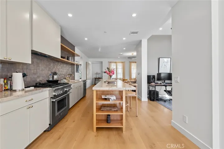 Past the newly landscaped front yard and custom iron front door, the home opens to a living room with an updated fireplace and chimney, flowing into a chef’s kitchen with slim-shaker soft-close cabinetry, Calacatta Taupe Quartzite counters and island, Zia Zellige backsplash, Rejuvenation hardware, Newport Brass fixtures, and a Thermador appliance suite. The dining area overlooks Cyprus trees and the pool, with a nearby flexible room for office or family use.