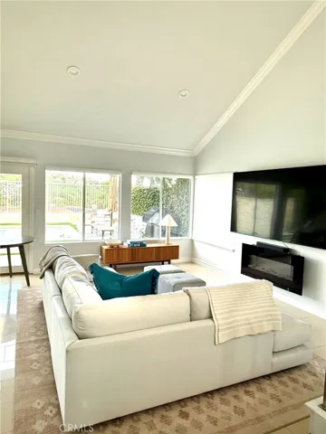 This stunning single-family home features soaring ceilings that create an open and airy atmosphere. The living and family rooms are filled with natural light, offering a bright and welcoming feel throughout, with serene views of the sparkling pool, waterfall, and colorful lighting. The backyard also includes a designated sitting area with a fire pit, making it perfect for both relaxing and entertaining.