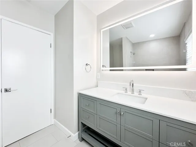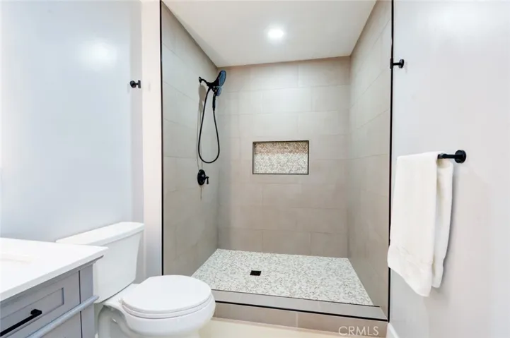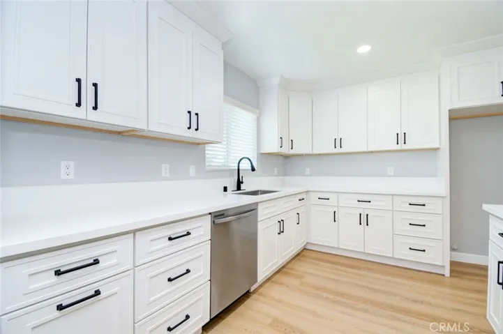 The kitchen has been redesigned and boasts elegant white shaker cabinets, pristine white quartz countertops, and all-new appliances. It is highly functional and offers ample cabinetry for storage, along with a new stove, dishwasher, and microwave.