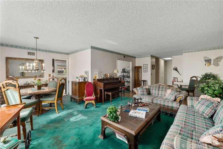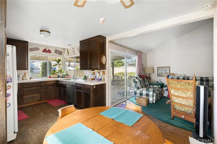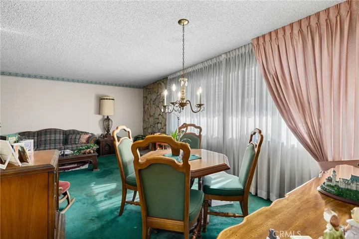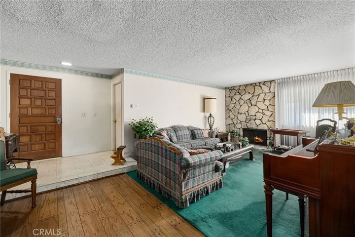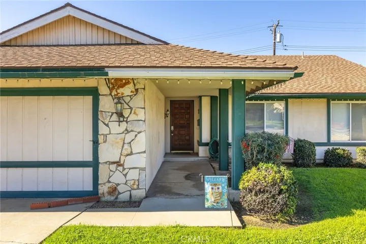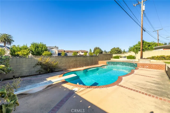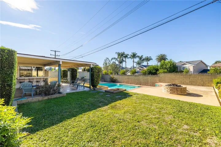 Single-story pool home located in a prime La Verne neighborhood. Attractive curb appeal welcomes you with a manicured lawn, planters, and a long covered patio that leads to the front entry. Inside, the front door opens to a tiled entryway and into both the living and family rooms. The living room features hardwood flooring and a floor-to-ceiling stone fireplace, with an adjacent dining room offering direct access to the kitchen. The kitchen includes wood cabinetry, tiled countertops, panoramic backyard views, and a breakfast nook, all open to the family room for easy everyday living. The family room offers vaulted ceilings, carpeted flooring, and a sliding door that provides access to and views of the backyard. Down the hall are four bedrooms. The primary bedroom enjoys backyard views and includes an ensuite bathroom with a walk-in shower and sliding glass enclosure. Three additional bedrooms are generously sized and share a full hall bathroom. The backyard is ideal for outdoor living, featuring an oversized pool with an elevated tiled backsplash, custom brickwork, a gas fire pit, ample lawn space, and a covered patio that spans the width of the family room and kitchen. Side yards include walkways, with one offering a grass strip that works perfectly as a dog run.