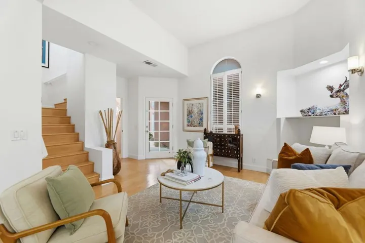 Experience refined Mediterranean-style living just steps from vibrant downtown Los Altos. This elegant end-unit offers a rare blend of privacy, abundant natural light, an attached garage with a private driveway, a gourmet chef’s kitchen with a new refrigerator and dishwasher. The sun-filled living room, highlighted by soaring ceilings, opens through sliding glass doors to a secluded private patio ideal for seamless indoor-outdoor entertaining. Upstairs, a spacious landing provides flexible space perfect for a home office. Two generously sized en-suite bedrooms offer exceptional comfort, including a serene primary suite with sliding glass doors that open to a large private balcony, an inviting retreat for morning coffee or evening relaxation. Within walking distance to dining, cafés, groceries, and boutique shopping in charming downtown Los Altos, and close proximity to Stanford University, the Stanford Shopping Center, and downtown Palo Alto, making this home a truly rare find.