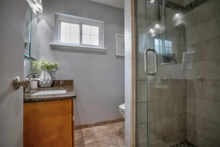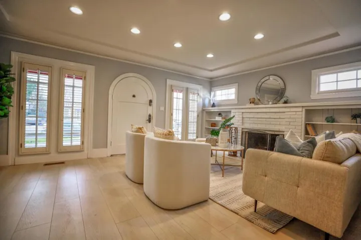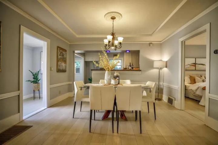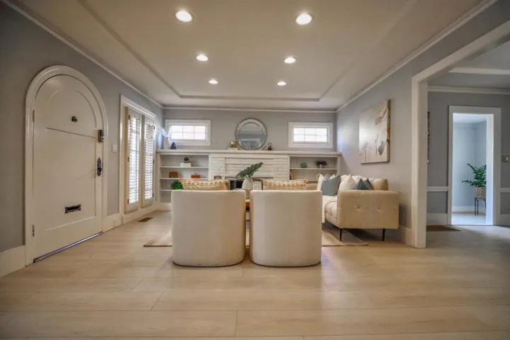 Experience the charm of this beautifully updated 1925 bungalow with Spanish influences, ideally located on a tree-lined street in the desirable Garden Alameda neighborhood. The spacious, light-filled living room features floor-to-ceiling windows with plantation shutters, crown molding, recessed lighting, a classic, inviting fireplace with a new tiled hearth, and built-in bookshelves. The formal dining room with a breakfast bar opens to the updated kitchen. An enclosed side porch is perfect for a home office or exercise room. Two front bedrooms share a tastefully updated bathroom with a heated tile floor. New SPC flooring runs throughout the home. The kitchen boasts solid granite countertops, white cabinetry, a large pantry, and direct access to the large deck and backyard. A convenient laundry room offers built-in linen shelving. The primary bedroom features sliding doors to the rear deck and a remodeled en-suite bathroom with tile flooring. Recent upgrades include a newer water heater, furnace, air conditioning system, and a 7-year-old roof. A fully owned solar system provides significant energy savings. Unbeatable location blocks from Alameda’s popular restaurants, Caltrain station, SAP Center, Whole Foods, and more. Open House Sat & Sun.