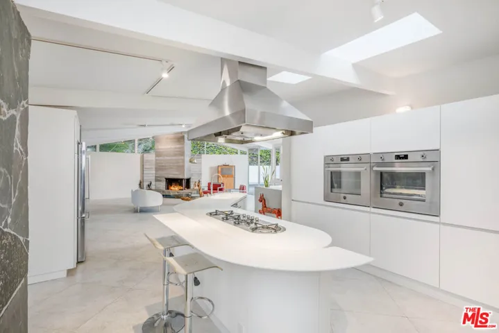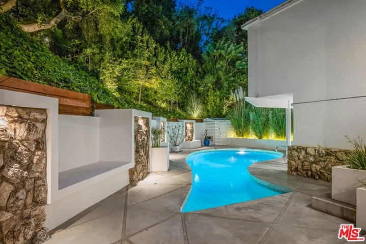 Nestled in the secluded hills of Franklin Canyon, this residence thoughtfully balances mid-century modern architecture with contemporary, material-driven updates. The original structure defined by open volumes, clerestory windows, and expansive walls of glass remains easy to read, while later remodels introduce a textured, organic sensibility that complements the modernist framework. Natural light permeates the open-plan living spaces, reflecting off steel-troweled cement walls and contrasting textures throughout the interiors. A consistent material palette, expressed through the textured fireplace surround, smooth hand-troweled kitchen finishes, and built-in planters, creates a tactile dialogue that bridges eras while preserving architectural clarity. A sculptural concrete and stone fireplace anchors the living room, emphasizing the connection between structure and material. The kitchen, featuring a custom curved island and bespoke cabinetry, serves as a central architectural element, reinforcing the home’s focus on flow and craftsmanship. The entire upper level is devoted to the luxurious primary suite, conceived as a serene retreat with a private balcony overlooking the lush, secluded backyard. The suite includes a spa-inspired bath with a cement soaking tub and separate shower, dual closets, and a private water closet with sink. Two guest bedrooms are located on the main level, while a versatile office or glam room on the lower level supports productivity, creativity, or quiet retreat, seamlessly blending function and design. Outdoors, lush palms and hedges ensure exceptional privacy. Built-in concrete benches, framed in the home’s original mid-century stone, establish continuity between the front facade and the backyard, while a water feature set within one of the recessed bays provides a serene focal point. Together with a saltwater pool, deck, fire bowl, and intimate lounge areas, these elements extend the modernist ethos seamlessly into the landscape. Situated between Franklin Canyon Park and TreePeople conservation lands, the property offers a rare balance of seclusion and proximity, embodying a home shaped by light, material, and nature.