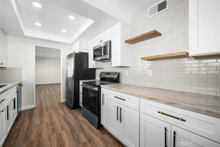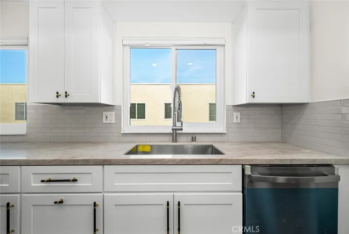 The kitchen showcases new white shaker cabinets, quartz-style countertops, subway tile backsplash, open wood shelving, and brand new stainless steel appliances, including refrigerator, stove, microwave, and dishwasher. A large window over the sink brings in natural light, creating a clean and inviting cooking space.