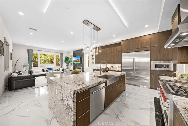 The open-concept kitchen showcases floor-to-ceiling cabinetry, premium Wolf appliances, Sub-Zero refrigerator, a marble waterfall island with an extended breakfast table, and walk-in pantry. The light-filled Great Room features three-sided windows and an upgraded linear fireplace, while the formal dining area includes a temperature-controlled wine cooler and opens to the California room with a dual-sided bar and outdoor kitchenette.