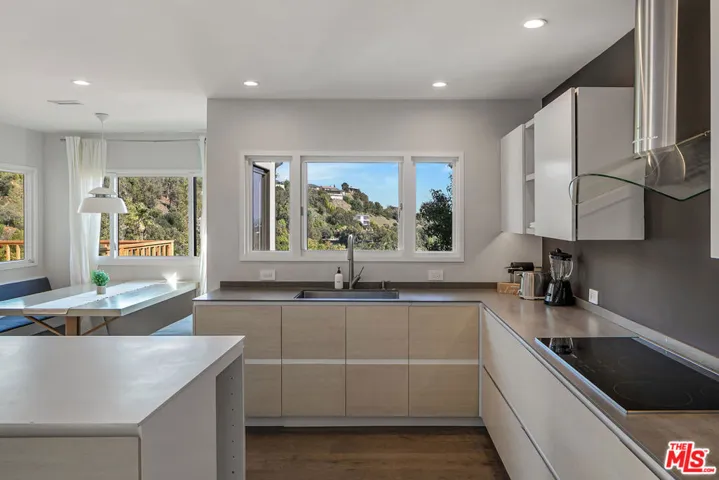 Panoramic canyon and city views, expansive outdoor living, and refined modern interiors define this newly reimagined architectural retreat perched above the street on coveted Carman Crest Drive. Privately set and thoughtfully redesigned, this residence blends elevated Hollywood Hills living with warmth, scale, and effortless indoor-outdoor flow. A dramatic entry welcomes you into a light-filled open floor plan where wide-plank wood floors and clean architectural lines create a sense of calm and volume throughout. The living and dining spaces unfold seamlessly into a stunning entertainer’s deck through oversized retractable glass doors framing sweeping hillside vistas and creating an ideal setting for sunset gatherings, al fresco dining and everyday California living. The open-concept kitchen is both functional and refined, featuring a generous center island, sleek modern cabinetry, and integrated appliances, all designed to connect effortlessly with the adjacent dining nook and living areas. Natural light pours in from multiple exposures, enhancing the home’s organic palette and tranquil atmosphere. The primary suite is a private retreat, offering serene views, ample closet space, and a spa-inspired bathroom with clean lines, modern finishes, and a calming, understated aesthetic. Additional bedrooms are thoughtfully laid out and well-proportioned ideal for guests, home offices, or creative studios each maintaining the home’s cohesive design language. Outdoors, the expansive deck and private yard provide rare usable space in this hillside setting, perfect for lounging, entertaining, or quiet moments surrounded by nature. A spacious two-car garage and additional storage complete the home, offering both convenience and practicality. Located moments from Hollywood, Studio City, and the iconic trails of Griffith Park, this refined hillside residence delivers privacy, views, and architectural integrity an inspired offering for buyers seeking elevated design and effortless Los Angeles living.