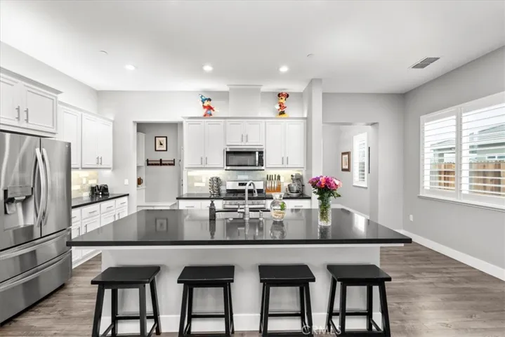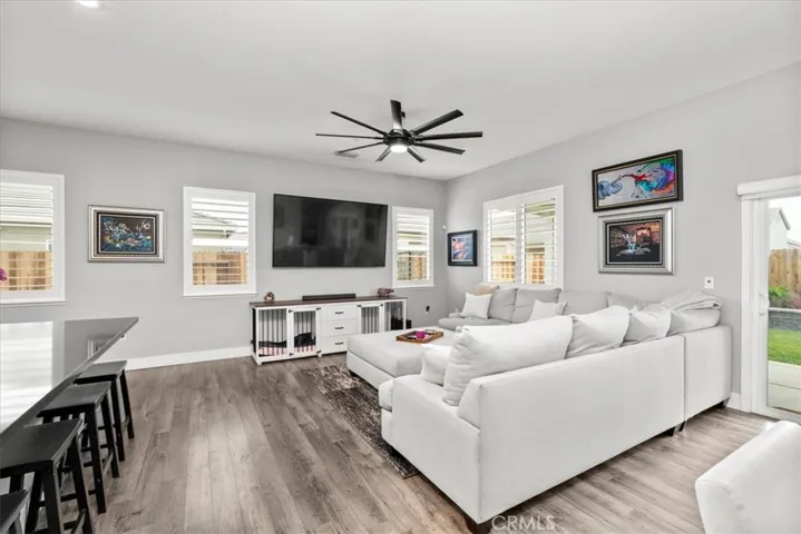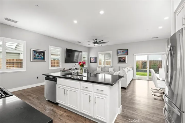 Inside, a bright and open concept floor plan unfolds, highlighted by plantation shutters, recessed lighting, and a seamless flow between the living room, dining area, and kitchen deal for effortless entertaining, especially as spring approaches. The kitchen is a true showpiece, featuring upgraded countertops, a designer backsplash, and enhanced cabinetry that blend style with functionality in a timeless way.