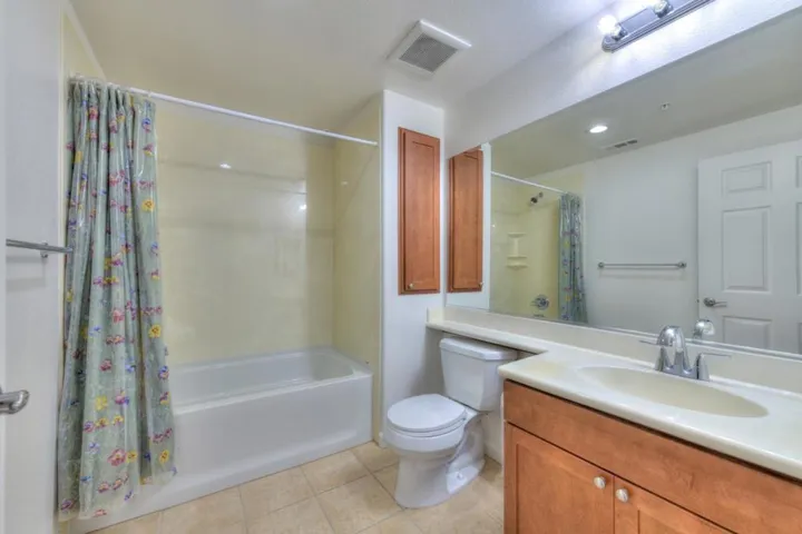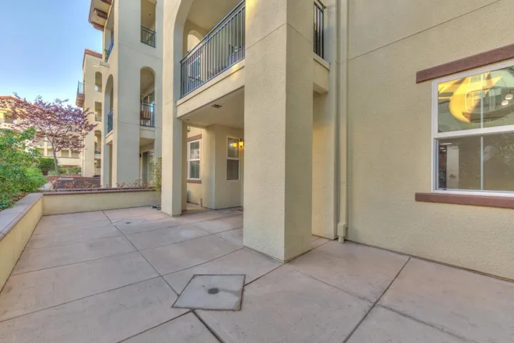 Discover this beautifully upgraded 2-bed, 2-bath, 1,259 sq ft single-level condo, built in 2007 and lovingly maintained by its original owner, located on the serene courtyard level (2nd floor) of the Terra Serena Luna community. No neighbor on one side, the spacious west-facing patio enhanced with lush greenery that offers natural privacy extends your living space and pairs perfectly with the open layout, making it ideal for relaxing, entertaining, and providing a great space for children to play and explore. The spacious primary suite features a walk-in closet, double vanity, soaking tub, and separate shower. Upgrades include stylish engineered hardwood floors, granite kitchen countertops, new carpet, fresh paint, new stainless steel appliances, new energy-efficient LED lights, and new ceiling-mount LED fixtures. Enjoy in-unit laundry, central heat and A/C, two detached private garages, and a nearby exterior storage room. The unit is also just steps from both the elevator and stairs. Community amenities include EV chargers, a clubhouse, gym, pool, jacuzzi, BBQ area, playgrounds, landscaped courtyards, and elevators. HOA dues include water, garbage, and insurance. This condo is within walking distance of the Great Mall, light rail & a nearby park. Some photos virtually staged.
