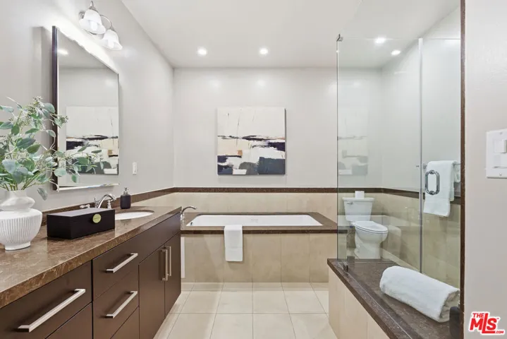 Extremely rare opportunity in Encino! Welcome to Unit 106 at 5240 Zelzah, a standout residence in an intimate, boutique 14-unit building. Believed to be one of the largest floor plans in the community and among the largest condo units in Encino, this home offers exceptional space, privacy, and a highly desirable layout. The 3-bedroom, 2.5-bath residence features a coveted double primary suite design, ideal for multi-generational living, guests, or a flexible work-from-home setup. Both primary bedrooms include built-in closets, with the main primary suite offering dual closets for ample storage. This is the only unit in the building with two private patios, a rare and highly sought-after feature. Enjoy a large main patio off the living and dining areas perfect for indoor-outdoor entertaining plus a second patio located next to the third bedroom. The living room is anchored by a fireplace and enhanced by higher-than-average ceiling heights in select areas, creating an open and airy feel throughout. The kitchen is thoughtfully updated with recessed LED lighting and LED under-cabinet illumination, complementing the home’s modern aesthetic. Recent upgrades completed within the last month include brand-new flooring and new dining room windows, featuring a new sliding glass door and stationary window, allowing for abundant natural light. An in-unit washer and dryer adds convenience and modern comfort to this exceptional home. Residents enjoy a full suite of amenities including a pool, jacuzzi, sauna, and a recreation/common area. The unit includes two side-by-side ground-level parking spaces, plus seven guest parking spaces an exceptionally rare offering for Encino condominiums. A truly unique property combining size, layout, upgrades, and amenities this is Encino condo living at its best.