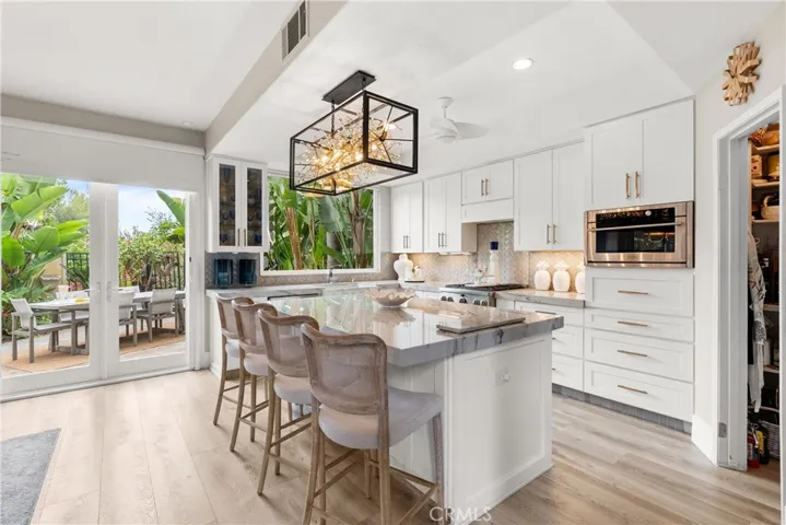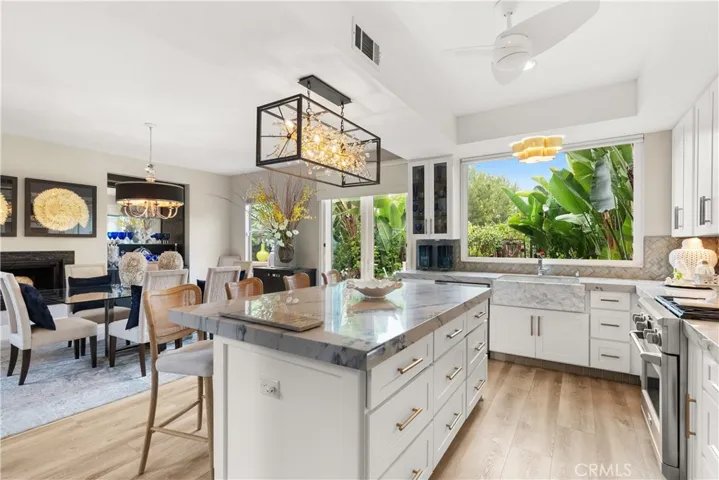 Stunning residence located at 27791 Camino Del Rio within the gated San Juan Hills community in San Juan Capistrano, offering an open floor plan, mountain and city light views, and a golf course setting with no ball exposure. Thoughtfully designed for entertaining and everyday living, the home showcases quality craftsmanship and high-end finishes throughout. The gourmet kitchen features quartzite countertops, a large center island with additional storage, a marble farmhouse sink, walk-in pantry, and premium appliances including a Dacor 42-inch refrigerator, Monogram cooktop and oven, Advantium microwave/oven, and pull-out oven fan. The kitchen opens seamlessly to the main living areas highlighted by a gas fireplace. A light-filled loft provides flexible space suitable for a home office, lounge, or secondary living area. The primary suite includes a spa-inspired bathroom with a large walk-in shower, glass sinks, and dual vanity mirrors. Interior features include shutters throughout, four ceiling fans, and luxury vinyl tile flooring on the main level. Outdoor living areas are designed for indoor-outdoor flow and entertaining, featuring a wrap-around patio, paved entry courtyard, tranquil fountain, hardscape lighting, and a built-in grill and bar with granite counters and stove, positioned to capture scenic mountain and city light views. Additional features include epoxy garage flooring, new garage door opener, Tesla EV charger, Water Boy whole-house filtration system, ADT security system, glass-designed front door, disappearing front and rear screen doors, French doors, new tile roof, primary bedroom security screen, overhead garage storage racks, and under-stair storage. Enjoy a private, elevated setting with access to community amenities including a pool, spa, and equipped fitness center, along with nearby shopping and dining, scenic trails, and approximately 1.5 miles to downtown San Juan Capistrano.
