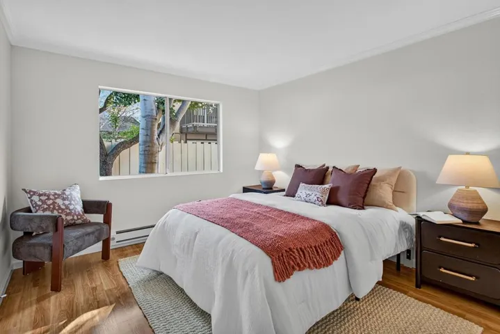 Set back from the street for added privacy and tranquility, this light-filled two-bedroom, one-bath end-unit offers comfortable living in a central Mountain View location. A tiled foyer opens to the ideal open-concept living spaces finished in a soft, neutral palette. The living room features light-hued engineered wood floors and sliding glass doors that open to a private fenced yard. An open dining area with yard-view windows is connected to the kitchen by a convenient pass-through for effortless entertaining. The kitchen includes deep countertops, white cabinetry, generous pantry storage, and a porcelain sink. Both bedrooms are privately situated with picture windows, large closets, and easy access to the nearby full bath. The yard offers a large concrete patio, a mature shade tree, and manicured plantings. Additional highlights include a community pool and clubhouse, covered carport parking with storage, ample guest parking, and a convenient Mountain View setting close to Google and other top tech employers, wonderful downtown amenities, and commute routes to all of Silicon Valley.