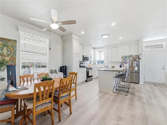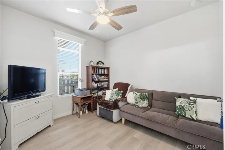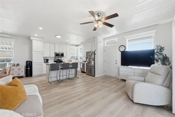 The open-concept floor plan features 2 bedrooms, 2 bathrooms, plus a versatile bonus room ideal for a home office, den, or guest space. Interior highlights include high ceilings, upgraded waterproof vinyl flooring, recessed lighting, and dual-pane windows throughout. The fully updated open kitchen showcases modern countertops, self-closing cabinetry, and included appliances, along with a separate laundry room with washer and dryer. Both bathrooms are beautifully finished, and the primary bedroom features a walk-in closet.
