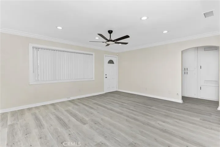 Freshly updated and move-in ready, this thoughtfully designed 4-bedroom, 2-bath home offers a functional layout with modern finishes throughout. Upon entry, you’re welcomed into a bright family room featuring crown molding and a ceiling fan, seamlessly open to the beautifully updated kitchen. The kitchen showcases white quartz countertops, quiet-close cabinetry, stainless steel appliances including a gas range, dishwasher, and microwave, plus a large center island with breakfast bar seating and additional storage—perfect for everyday living and entertaining. A nearby sliding door provides easy access to the rear patio and backyard.
