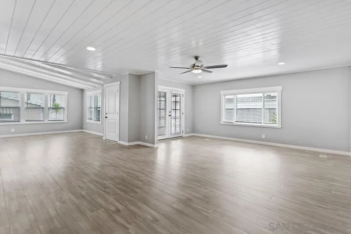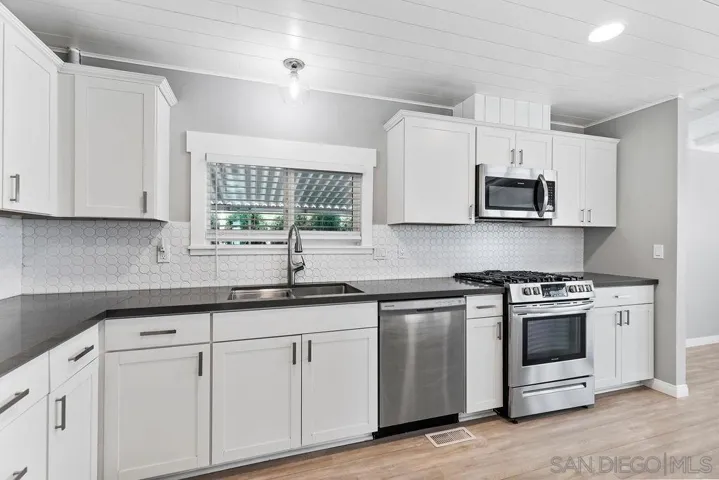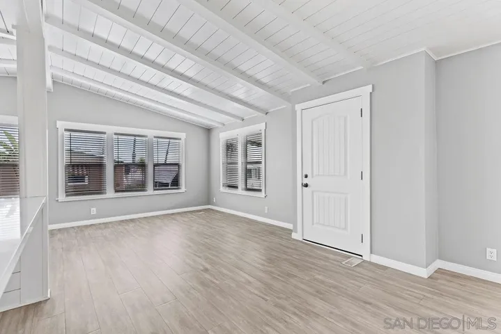 Stunning updated home with vaulted ceilings and easterly mountain views! Beautifully remodeled kitchen features a large quartz island w/ storage and stainless steel appliances. The open floorplan of the kitchen, living and dining areas allow plenty of space to entertain. Primary suite has dual sinks, soaking tub, step in shower, large linen closet, walk in closet & access into California room. Extra large utility room w/ oversized broom closet. Carport fits up to 2 vehicles and has a large secured storage. This unit is also located near guest parking spaces. Palomar West is a 5-star park with resort-style living with rent control & no property taxes on this home! This is a non-profit, 55+ park with a very active & social atmosphere – heated pool, spa, clubhouse, gym, tennis courts, pickleball and putting green.