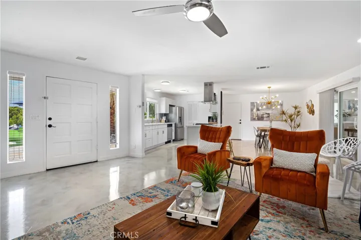 The home sits on an oversized lot with strong curb appeal and has been thoughtfully redesigned to balance clean modern finishes with comfortable, functional living. A bright, open floor plan is enhanced by custom concrete overlay flooring throughout, allowing natural light to flow seamlessly between living spaces.