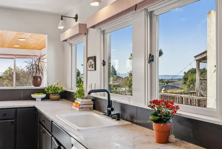 Bungalow reimagined! Gleaming modern touches throughout. Strong sightlines from updated living room straight through to the stunning sunset-view banquette dining area with a timeless bay view as well as an overlook of the open and welcoming outdoors. Sleek remodeled kitchen with Bertazzoni range and vent, spacious marble counter, new stainless-steel dishwasher and fridge. Wash dishes while seeing glimpses of bay and city views.  Stylish redone bathroom with new penny tile and sophisticated wallpaper.  Stunning custom exterior black steel spiral staircase leads to the sunny garden with Lemons, Limes, Persimmons, Apples and more… Raised beds for growing your very own herbs and vegetables. Inviting outdoor dining and relaxing spaces. Dedicated laundry room with storage galore. High ceiling unfinished bonus area downstairs with level in access from the backyard for workshop/storage/your imagination.  Sewer lateral Compliant.  BESO score 3.