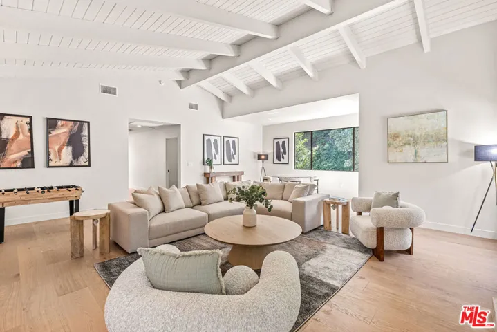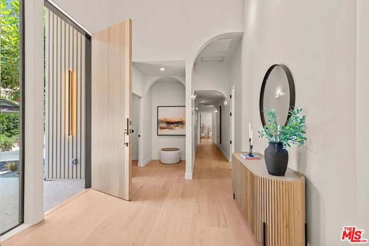 Tucked away on a peaceful street in one of Brentwood’s most coveted enclaves, this strikingly updated 4-bedroom, 6-bath modern residence offers refined design, impressive scale, and effortless livability. A dramatic 10-foot entry door opens to a voluminous interior highlighted by soaring 14-foot ceilings and an expansive, open layout ideal for both everyday living and entertaining. The heart of the home features a chef-caliber kitchen equipped with top-tier appliances, an oversized dining area, and multiple living spaces designed for seamless flow. These areas connect effortlessly to a private backyard retreat, complete with a newly constructed pool and spa, along with dedicated spaces for outdoor dining and relaxation.The primary suite serves as a true sanctuary, boasting a spa-inspired bathroom with dual vanities, a freestanding soaking tub, and a custom walk-in closet. Additional amenities include two thoughtfully placed powder rooms, a newly added theater, and a spacious entertainment lounge with a fireplace perfect for hosting gatherings or enjoying quiet evenings at home. Notable upgrades include a fire-resistant standing-seam metal roof, fully updated electrical and plumbing systems, and a generous three-car garage with ample storage. A rare opportunity to own a turnkey modern home in a premier Brentwood location.