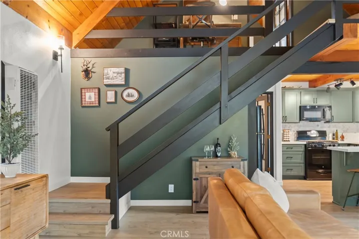 Inside the main cabin, soaring ceilings elevate the open-concept living, dining, and kitchen areas, creating a light-filled and welcoming atmosphere. Luxury updates are showcased throughout, including new LVP flooring, updated kitchen finishes with new countertops and backsplash, refreshed bathroom finishes, and fresh interior paint. A stunning stone hearth fireplace anchors the living space, while the open kitchen keeps the chef connected to the heart of the home. The main level also includes a bedroom, full bath, and laundry for everyday comfort and convenience.