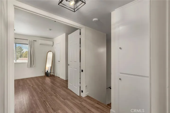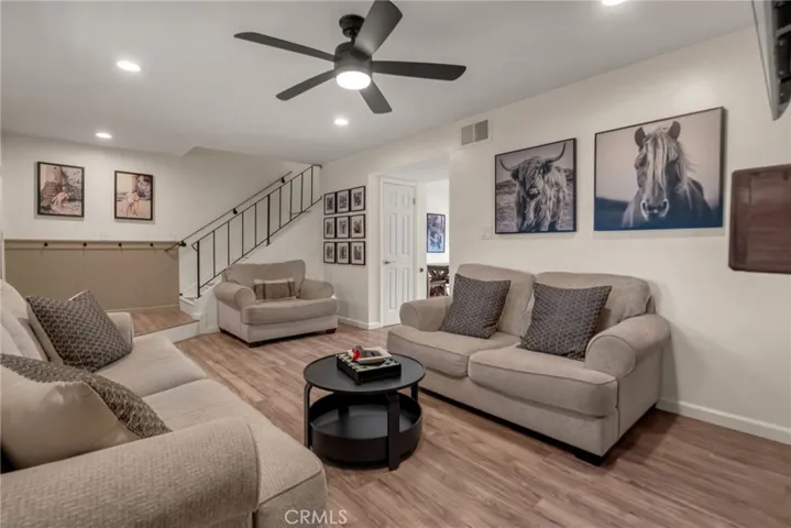 The main living space showcases wood-look laminate flooring, recessed lighting, and a contemporary fireplace feature wall that anchors the room. A convenient downstairs half bath adds everyday functionality for guests and daily living. Sliding glass door leads to a private patio finished with pavers and artificial pet-friendly turf, offering a low-maintenance outdoor space ideal for entertaining, relaxing, or letting pets enjoy the outdoors.